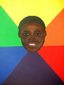 Det var et meget "tænkt" maleri af min søn med bl.a. afrikanske symboler. Men der var en del, der ikke fungerede i maleriet. Kompositionen blandt andet. Det fik lov at hænge længe, så jeg kunne få nye idéer til at komme videre med med det. En morgen vågnede jeg op og fandt ud af, hvad det var, der først og fremmest IKKE fungerede. Jeg havde jo fremstillet min søn som hvid. En detalje, jeg slet ikke havde set, fordi baggrunden jo var delvist brun..... Virkelig mærkeligt.......